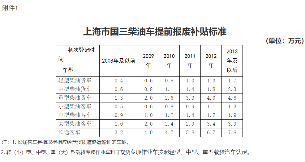 提前報廢國三柴油車補貼金額按照柴油車的類型、初次登記年限給予補貼。在本辦法發(fā)布之日前取得相關營運證的長途客車(省際班車、省際包車),可按相應標準給予補貼。具體補貼標準見附件1。