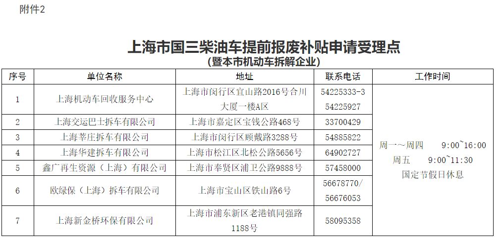市生態(tài)環(huán)境局會同市商務委、市公安局、市財政局、市交通委指導第三方機構在本市各機動車拆解企業(yè)所在地設立“上海市國三柴油車提前報廢補貼申請受理點(暨本市機動車拆解企業(yè))”(附件2)開展相關工作。