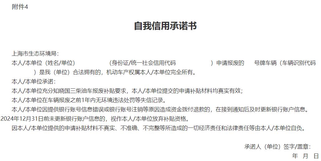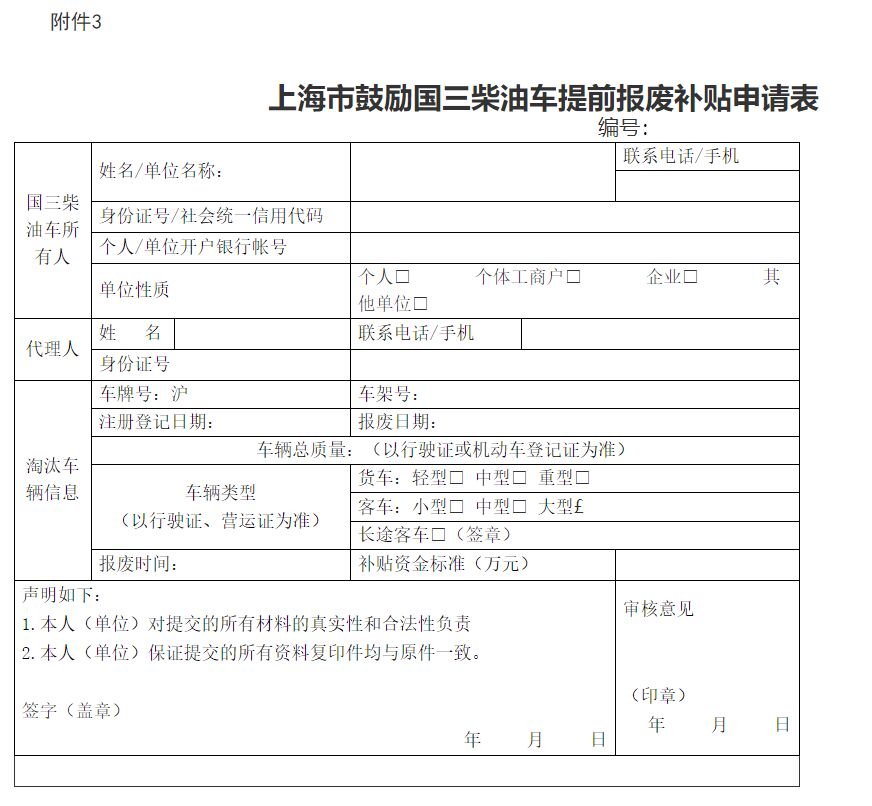 (五)申請長途客車報廢補貼的應在《上海市鼓勵國三柴油車提前報廢補貼申請表》里勾選并簽名或蓋章;