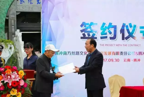 金秋時(shí)節(jié),騰沖南方絲路旅游投資發(fā)展有限公司和騰沖市騰沖翡翠加工基地,簽署戰(zhàn)略合作協(xié)議。為示祝賀,云南省寶協(xié)專家委員會主任,肖永福先生贈送其親撰《翡翠大辭典》部分手稿及親繪《牡丹長卷》給翡翠博物館收藏展示。