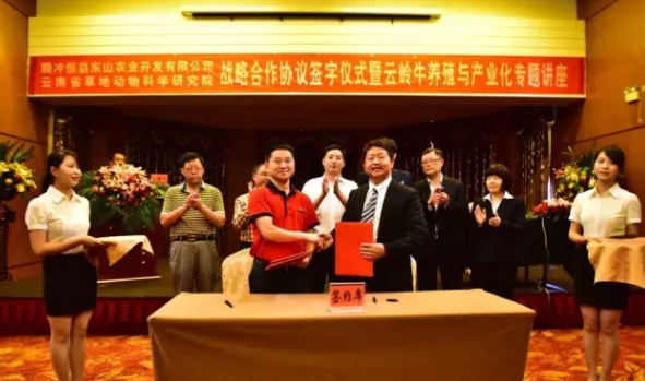 騰沖恒益東山農(nóng)業(yè)開(kāi)發(fā)有限公司與云南省草地動(dòng)物科學(xué)研究院為響應(yīng)騰沖“三山融城工程”建設(shè)號(hào)召,進(jìn)一步做實(shí)東山旅游度假區(qū)的開(kāi)發(fā)工作。本著院企合作,優(yōu)勢(shì)互補(bǔ),互惠互利,共同發(fā)展的原則通過(guò)前期的溝通了解,就東山牧場(chǎng)規(guī)劃、草地建設(shè)管理、優(yōu)質(zhì)肉牛養(yǎng)殖、牛肉產(chǎn)品研發(fā)及休閑旅游食品開(kāi)發(fā)等方面達(dá)成了戰(zhàn)略合作意向。