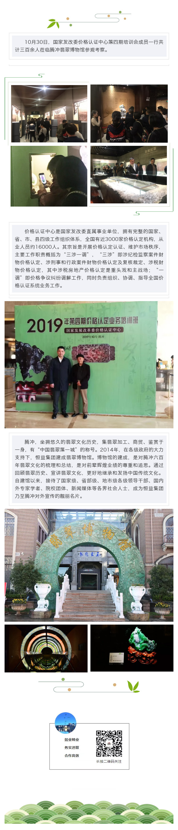 國家發(fā)改委價格認(rèn)證中心第四期培訓(xùn)會成員參觀考察騰沖翡翠博物館 來源: 瀏覽量:8870 日期:2019-11-01 分享到: 上一篇:中國地質(zhì)大學(xué)(武漢)王焰新校長一行蒞臨翡翠博物館參觀考察 下一篇:蒙古第八批高中級領(lǐng)導(dǎo)干部考察團(tuán)蒞臨高黎貢文化創(chuàng)意產(chǎn)業(yè)園區(qū)參觀考察
