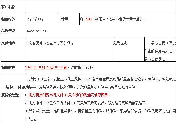 騰沖市恒益礦產(chǎn)品經(jīng)貿(mào)有限責(zé)任公司(以下簡稱“我司”)根據(jù)生產(chǎn)經(jīng)營安排,將面向社會對我司2020年10月前所產(chǎn)鋅精礦進(jìn)行公開競價銷售,誠邀廣大有合作意向的客戶前來咨詢并參與競價,現(xiàn)將相關(guān)事宜公告如下: