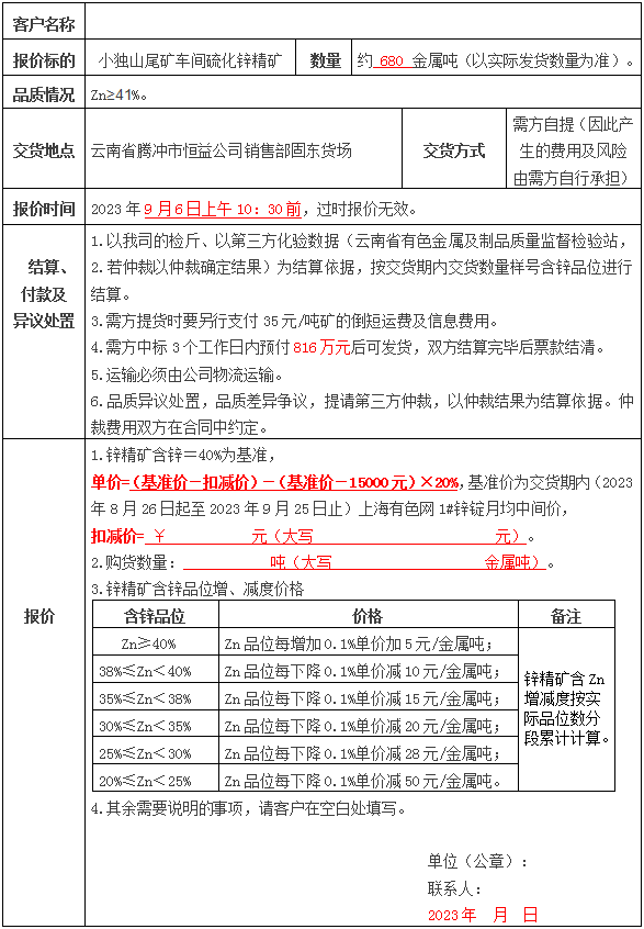 七、其它要求:(一)報價方中標后不履行后續(xù)相關(guān)手續(xù)或未在三個工作日內(nèi)與我司洽談并簽訂《硫化鋅精礦購銷合同》并預(yù)付816萬元貨款的,將視為不誠信行為并承擔締約過失責任,我司將扣除50%的信譽保證金,并納入我司客戶誠信檔案黑名單,我司有權(quán)拒絕該方今后競價。(二)報價方競價前已預(yù)付貨款且未中標的,競價后我司在十個工作日內(nèi)無條件退回該預(yù)付款(無息退還本金)。(三)具體購銷事宜在中標后雙方簽訂的購銷合同中約定,本公告與購銷合同不一致的,以購銷合同為準。(四)報價不符合要求的視為無效報價。(五)中標后發(fā)貨原則上以標書數(shù)量正負10%為準,如有超出或不足的雙方協(xié)商后以補充協(xié)議為準,且該范圍內(nèi)我司不承擔任何締約過失責任。