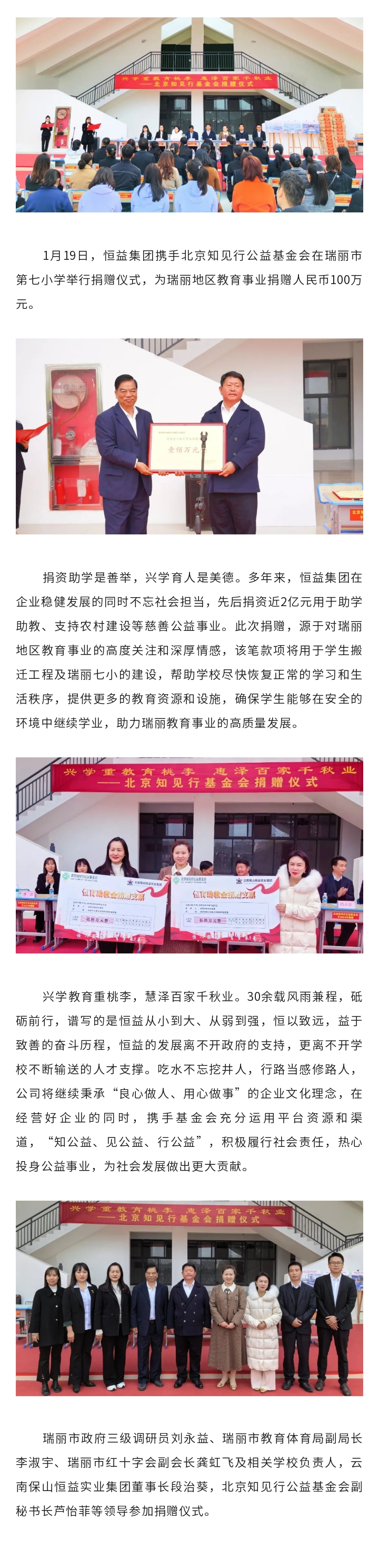 恒益集團(tuán)攜手北京知見行公益基金會為瑞麗地區(qū)教育事業(yè)捐贈100萬元 來源: 瀏覽量:4984 日期:2024-01-20 分享到: 上一篇:“拓市場,強(qiáng)管理,增效益,高質(zhì)量發(fā)展”——恒益集團(tuán)組織召開第二屆董事會第八次會議暨2023年度工作會議 下一篇:蕓草書香里的文脈傳承——記《蕓草合編》古籍點(diǎn)校贈詩雅事