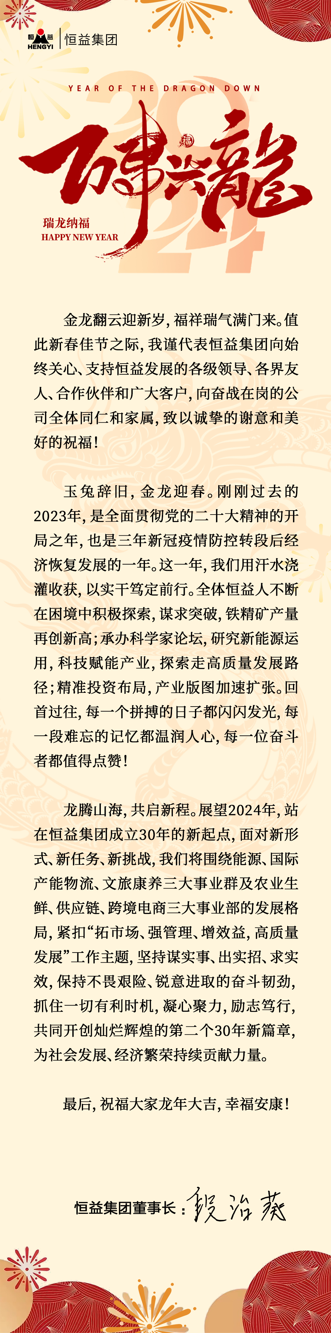恒益集團2024年新春賀詞 來源: 瀏覽量:5407 日期:2024-02-09 分享到: 上一篇:龍騰盛世,共舞新春丨恒益集團受邀參加緬甸華僑界龍年新春慶典 下一篇:強強聯(lián)合集聚發(fā)展效能 合作共贏助力產(chǎn)業(yè)騰飛