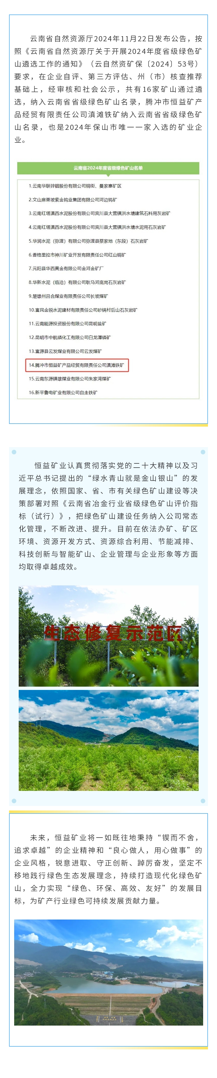 恒益礦業(yè)滇灘鐵礦成功入選云南省省級綠色礦山名錄 來源: 瀏覽量:4657 日期:2024-11-25 分享到: 上一篇:恒益集團(tuán)“薪火計(jì)劃2.0”:專業(yè)打磨與管理優(yōu)化并行,驅(qū)動(dòng)持續(xù)發(fā)展新引擎 下一篇:喜訊!恒益集團(tuán)獲得“2024云南企業(yè)100強(qiáng)”等多項(xiàng)榮譽(yù)獎(jiǎng)項(xiàng)