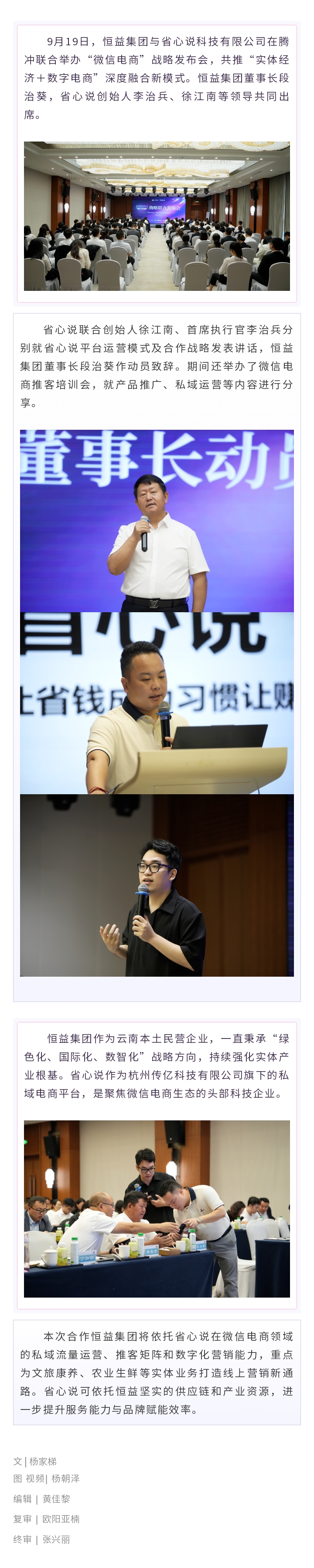 恒益集團(tuán)與省心說(shuō)科技達(dá)成合作 共筑微信電商新生態(tài) 來(lái)源: 瀏覽量:2290 日期:2025-09-19 分享到: 上一篇:榮登雙榜!恒益集團(tuán)榮獲2025云南民企百?gòu)?qiáng)第30位、服務(wù)業(yè)20強(qiáng)第8位 下一篇:喜訊丨恒益集團(tuán)榮膺2025年“騰沖市教育事業(yè)高質(zhì)量發(fā)展先進(jìn)集體”稱(chēng)號(hào)